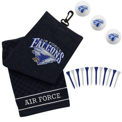 Each Air Force Falcons logo embroidered golf gift set includes a 16" X 26" embroidered tri-fold Air Force Falcons golf towel, 3 regulation Air Force Falcons golf balls, and 12 golf tees.