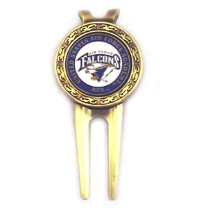 Air Force Falcons logo golf divot repair tool is a vital component for every golfer's game. Heavy gauge metal construction that will provide years of use to repair divots, mark your ball, and clean turf from your cleats. Top design of the Air Force Falcons logo divot repair tool is ideal for a club holder, and the integrated clip offers versatility, which can be used as a money clip or to hold the tool securely to your pocket or belt. Beautiful antique brass finish and approximately 3" in length. Large ball marker on the front that is magnetically held to tool with the Air Force Falcons logo and smaller marker on back of the Air Force Falcons logo divot repair tool that is magnetically held in place.