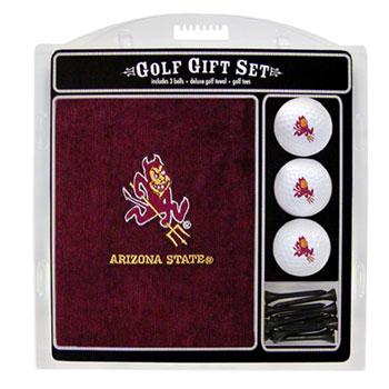 Each Arizona State Sun Devils logo embroidered golf gift set includes a 16" X 26" embroidered tri-fold Arizona State Sun Devils golf towel, 3 regulation Arizona State Sun Devils golf balls, and 12 golf tees.