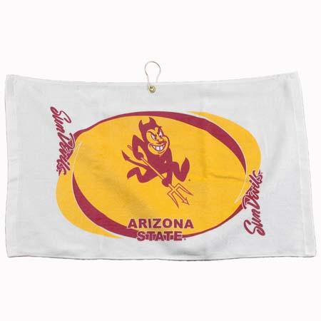 Standard weight 16" x 26" Arizona State Sun Devils logo printed golf towel, made of durable 100% cotton. Features a center placement brass grommet and hook that allows for easy access and keeps towel off the ground. Printed with the Arizona State Sun Devils trademark.