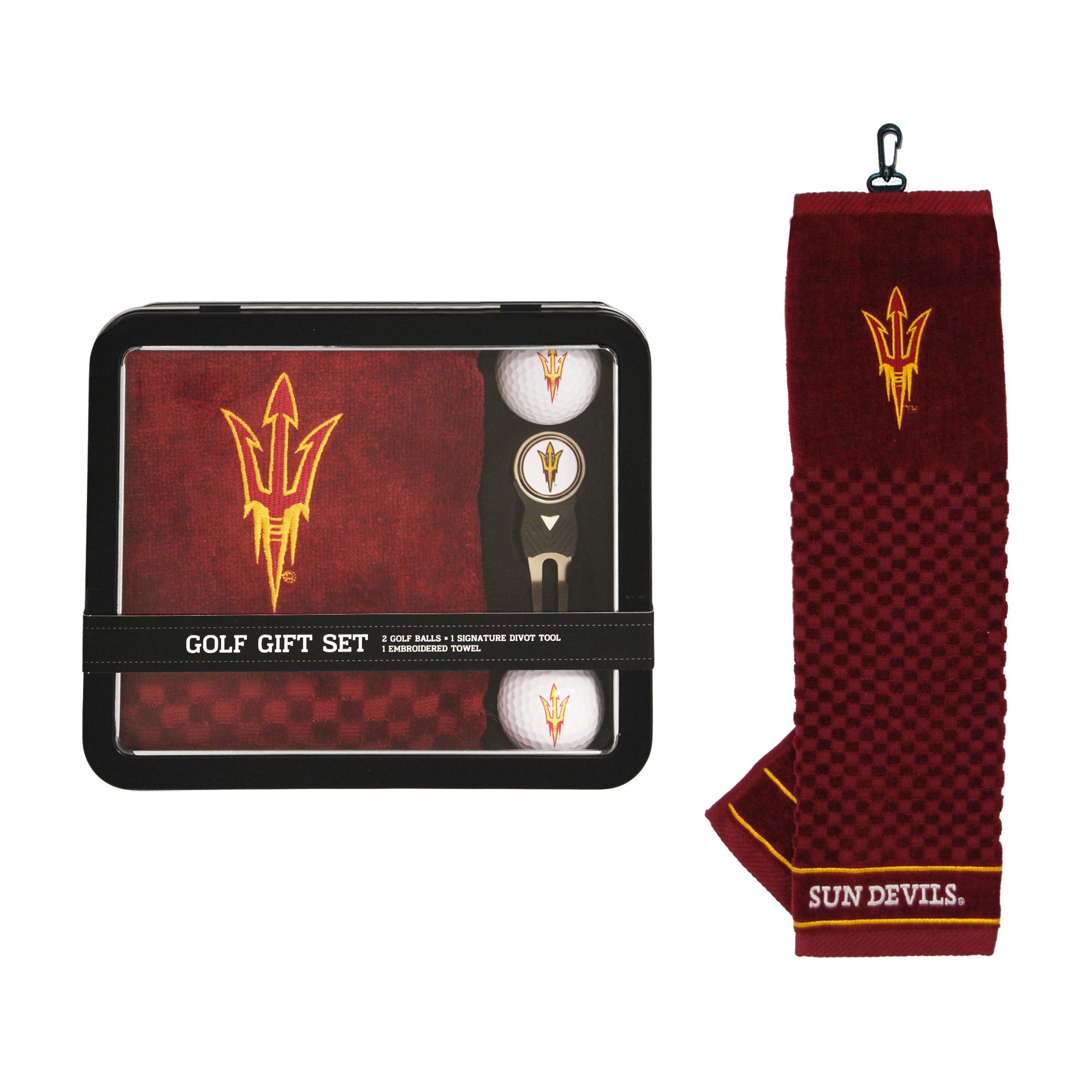 NCAA Golf Gift Set includes the following: (1)One Arizona State Sun Devils logo 16" x 22" 100% cotton tri-folded embroidered towel with scrubber pattern, swivel clip for easy bag attachment and team logo embroidery; (2) 2 Arizona State Sun Devils logo regulation golf balls with full color team logo durable imprint; and (3) One Arizona State Sun Devils logo specific divot tool and removable double sided enamel color fill magnetic marker, all housed in sleek tin packaging