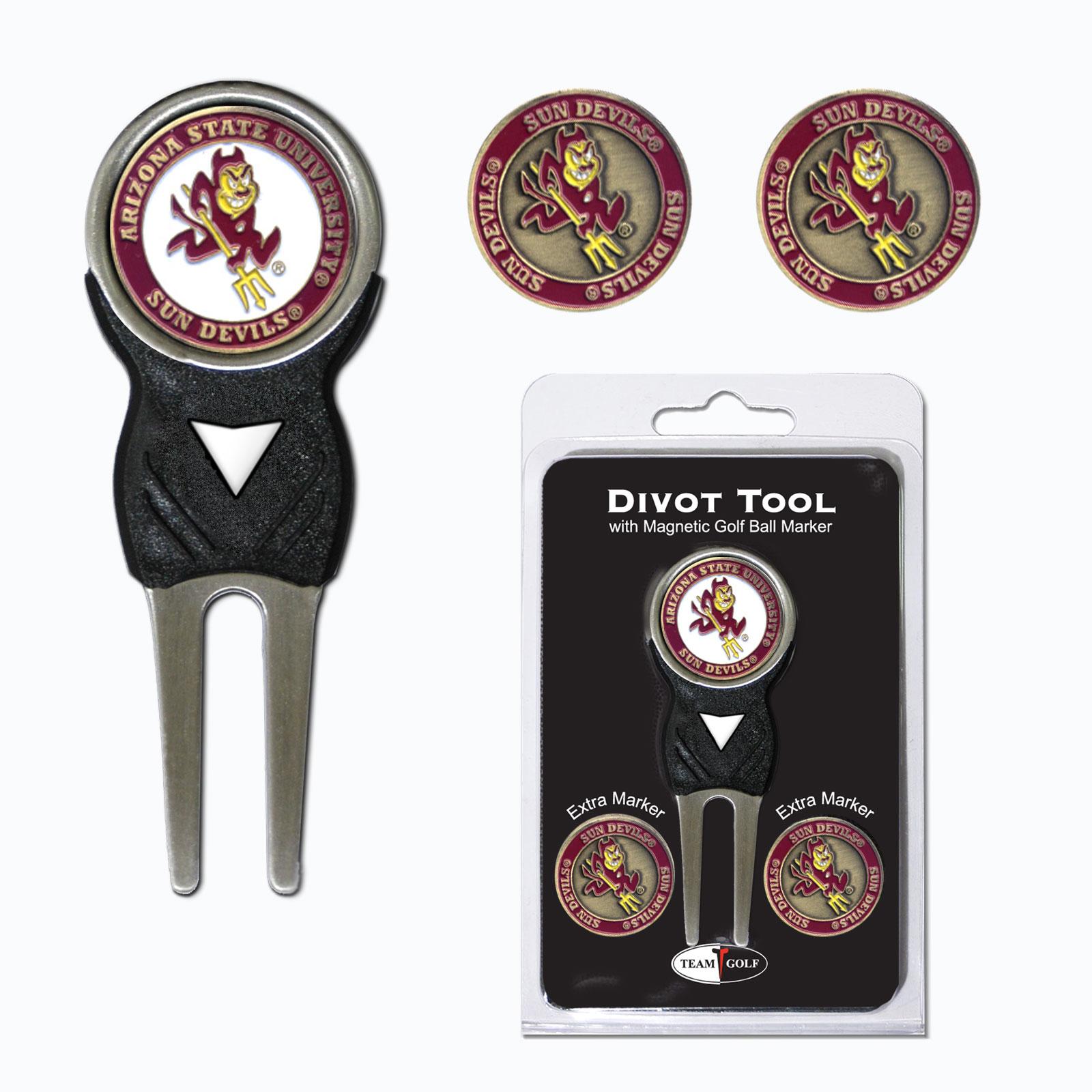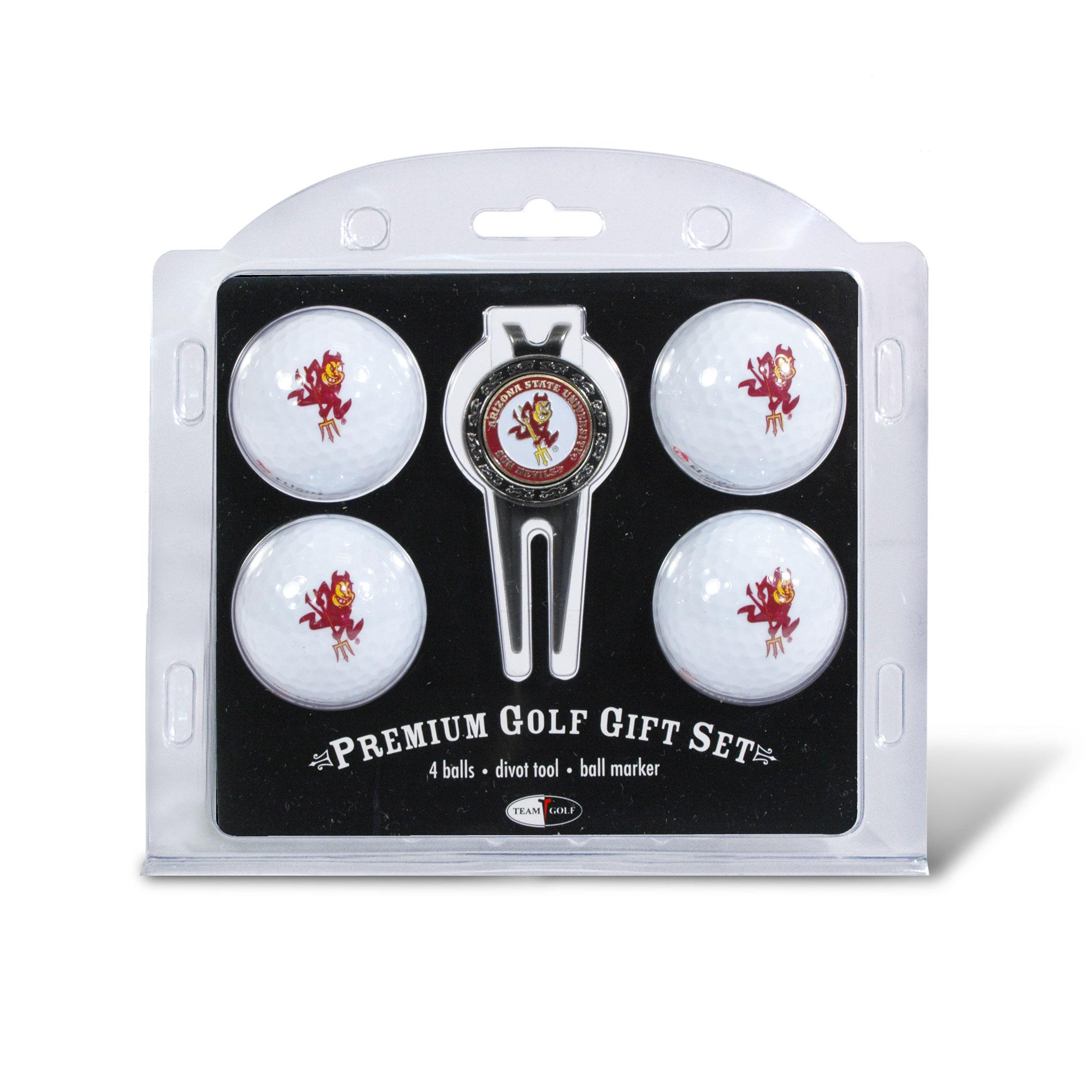 Arizona State Sun Devils logo 4 ball divot tool gift set contains 4 regulation imprinted golf balls, brass divot tool and 1 removable imprinted magnetic ball marker.