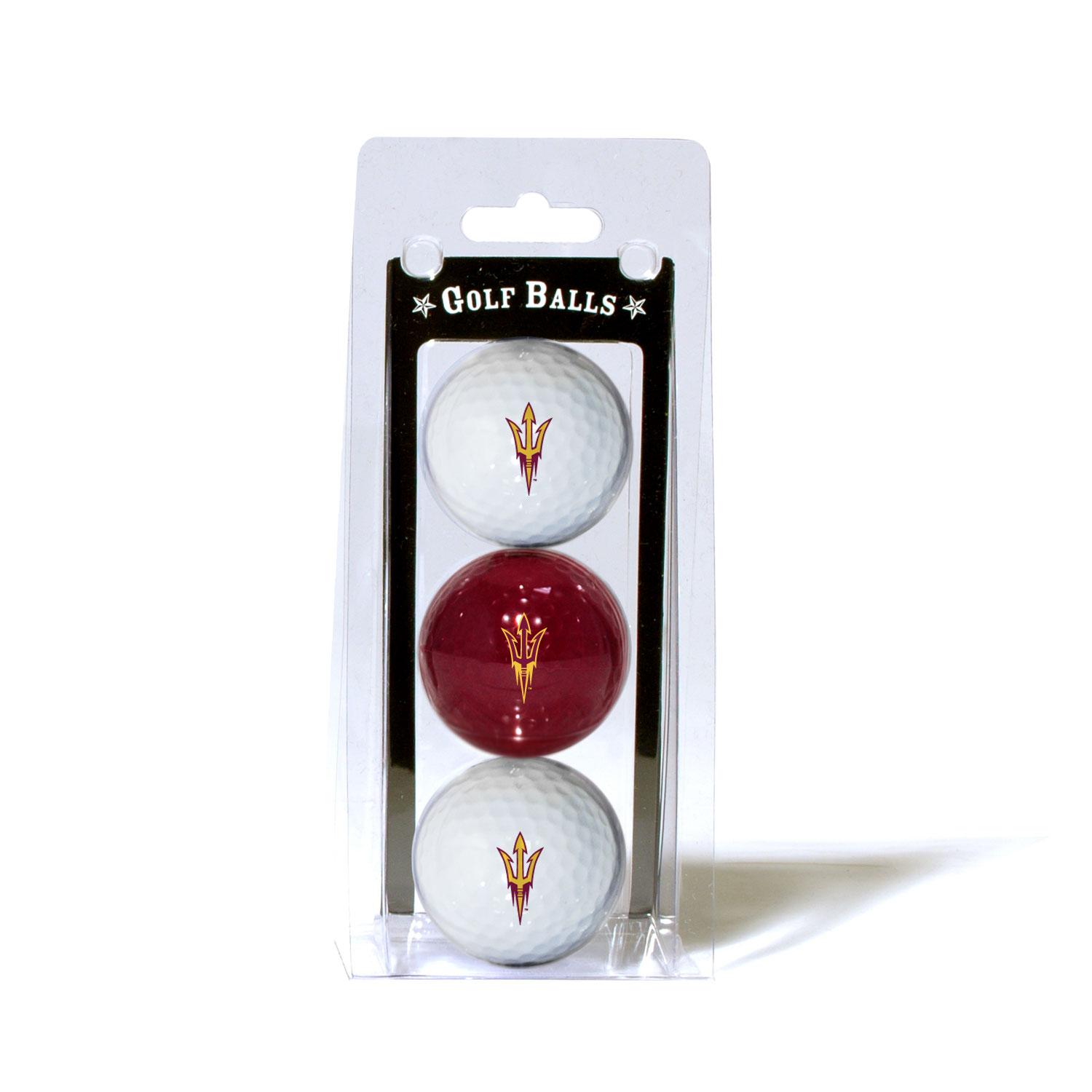 Three quality surlyn covered golf balls imprinted with the Arizona State Sun Devils college logo.