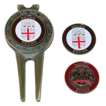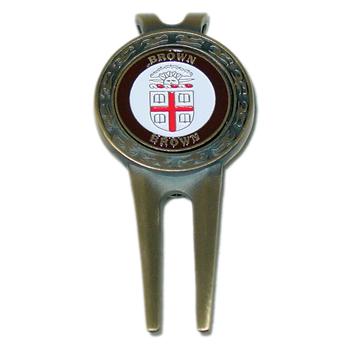 Brown Bears logo golf divot repair tool is a vital component for every golfer's game. Heavy gauge metal construction that will provide years of use to repair divots, mark your ball, and clean turf from your cleats. Top design of the Brown Bears logo divot repair tool is ideal for a club holder, and the integrated clip offers versatility, which can be used as a money clip or to hold the tool securely to your pocket or belt. Beautiful antique brass finish and approximately 3" in length. Large ball marker on the front that is magnetically held to tool with the Brown Bears logo and smaller marker on back of the Brown Bears logo divot repair tool that is magnetically held in place.