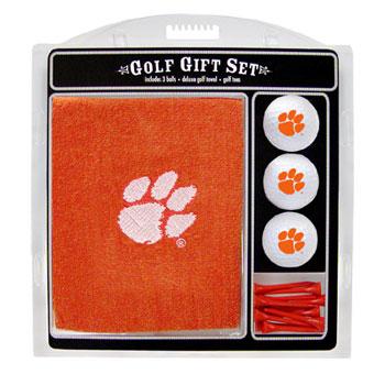 Each Clemson Tigers logo embroidered golf gift set includes a 16" X 26" embroidered tri-fold Clemson Tigers golf towel, 3 regulation Clemson Tigers golf balls, and 12 golf tees.