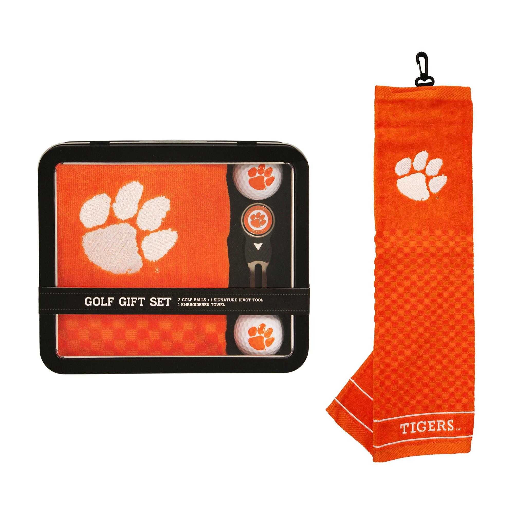 NCAA Golf Gift Set includes the following: (1)One Clemson Tigers logo 16" x 22" 100% cotton tri-folded embroidered towel with scrubber pattern, swivel clip for easy bag attachment and team logo embroidery; (2) 2 Clemson Tigers logo regulation golf balls with full color team logo durable imprint; and (3) One Clemson Tigers logo specific divot tool and removable double sided enamel color fill magnetic marker, all housed in sleek tin packaging