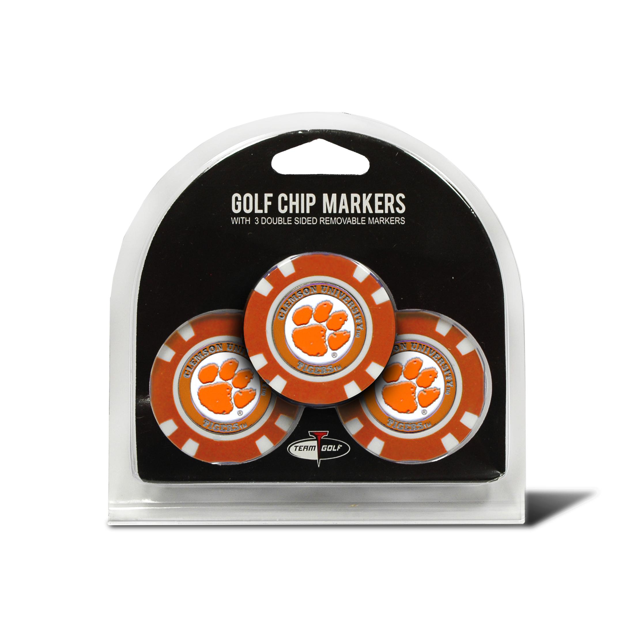 The Clemson Tigers Poker Chip Ball Marker Gift Set perfect gift for any fan, student, or alumni. The Clemson Tigers Poker Chips come with a Clemson Tigers Team Logo Removable ball marker in the center of each chip.