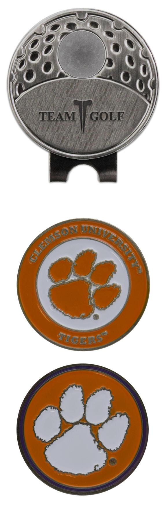 Large double-sided golf ball marker with the Clemson Tigers logo that is magnetically held to the metal clip which fits over the brim of your hat.