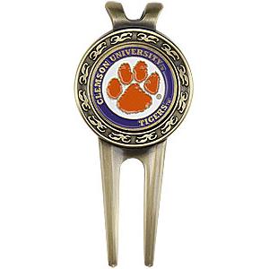 Clemson Tigers logo golf divot repair tool is a vital component for every golfer's game. Heavy gauge metal construction that will provide years of use to repair divots, mark your ball, and clean turf from your cleats. Top design of the Clemson Tigers logo divot repair tool is ideal for a club holder, and the integrated clip offers versatility, which can be used as a money clip or to hold the tool securely to your pocket or belt. Beautiful antique brass finish and approximately 3" in length. Large ball marker on the front that is magnetically held to tool with the Clemson Tigers logo and smaller marker on back of the Clemson Tigers logo divot repair tool that is magnetically held in place.