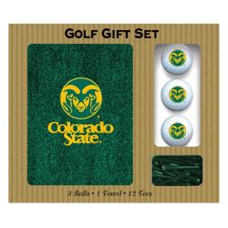 Each Colorado State Rams logo embroidered golf gift set includes a 16" X 26" embroidered tri-fold Colorado State Rams golf towel, 3 regulation Colorado State Rams golf balls, and 12 golf tees.