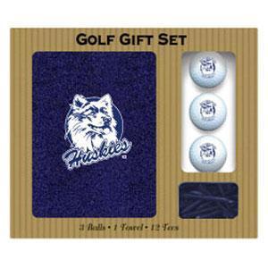 Each Connecticut Huskies logo embroidered golf gift set includes a 16" X 26" embroidered tri-fold Connecticut Huskies golf towel, 3 regulation Connecticut Huskies golf balls, and 12 golf tees.