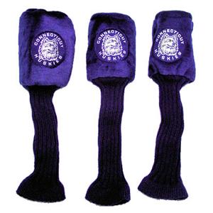 Set of three Connecticut Huskies logo golf graphite headcovers made of premium dense pile plush. Features a patented expandable inner sock lining to ensure a proper fit on your golf club and a longer knit sock for better shaft protection. Embroidered with Connecticut Huskies trademark on front. Embroidered numbering system 1, 3, and Connecticut Huskies trademark on top or X.
