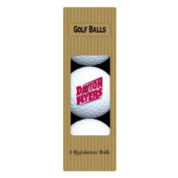 Three quality surlyn covered golf balls imprinted with the Dayton Flyers college logo.