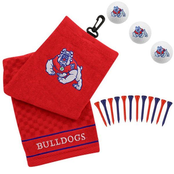 Each Fresno State Bulldogs logo embroidered golf gift set includes a 16" X 26" embroidered tri-fold Fresno State Bulldogs golf towel, 3 regulation Fresno State Bulldogs golf balls, and 12 golf tees.