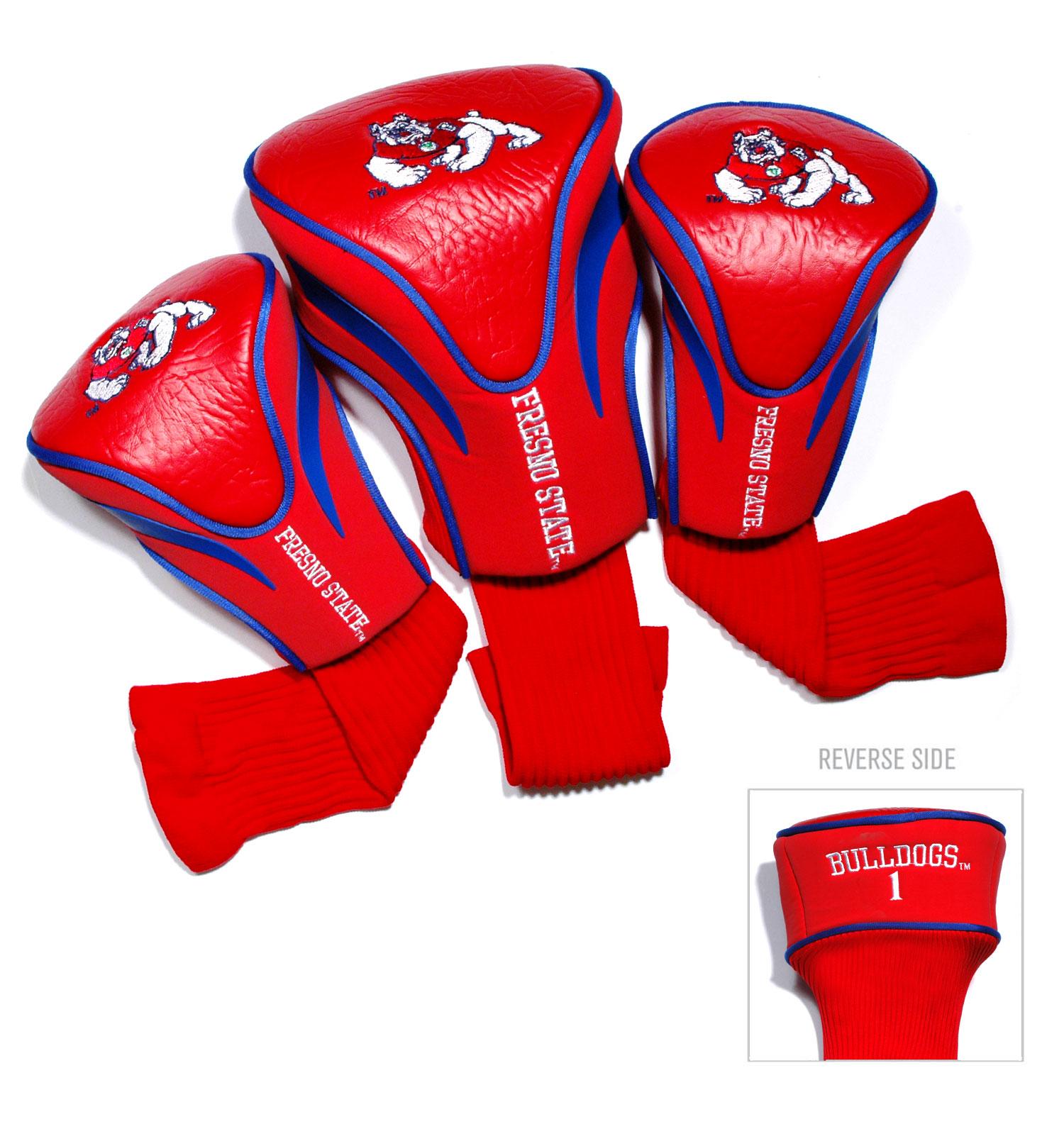 Fresno State Bulldogs Contour Fit Headcover Set. Take your team pride to the golf course with this Fresno State Bulldogs Contour Fit Headcover Set. Set includes 3 stylish contoured headcovers with innovative materials and sleek design - numbered 1, 3 and X. *The #1 fits all oversized drivers *Nylon sock protects shafts from damage *Officially licensed by the NCAA