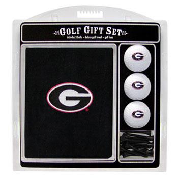 Each Georgia Bulldogs logo embroidered golf gift set includes a 16" X 26" embroidered tri-fold Georgia Bulldogs golf towel, 3 regulation Georgia Bulldogs golf balls, and 12 golf tees.