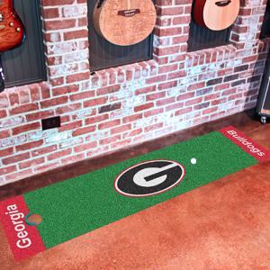 Practice your putting skills with this dual use Georgia Bulldogs logo runner. This realistic Georgia Bulldogs logo putting green runner acts as a putting practice surface as well as a runner with the Georgia Bulldogs color and logo. Looks good in your game room, office or any room you choose. Includes a secure fit plastic target barrier bumper under the Georgia Bulldogs logo mat that acts as a putting hole. Has a 11 on the Stimp meter, and it is made of a Chromojet-printed nylon surface with vinyl backing. Approximant measurements are 18” x 72", and it is officially licensed. Not available for expedited delivery. All mats are made to order therefore may take up to 2 weeks to ship.