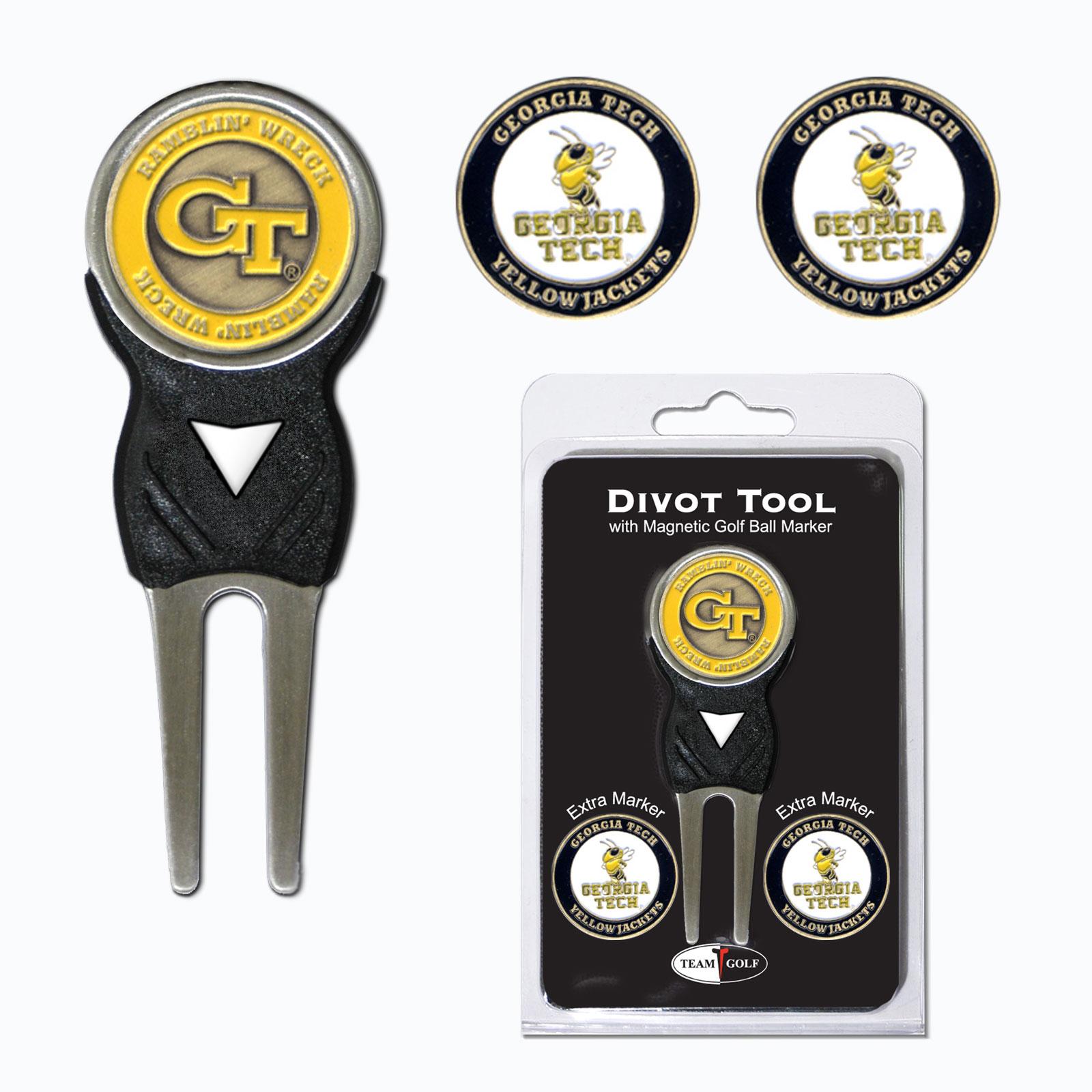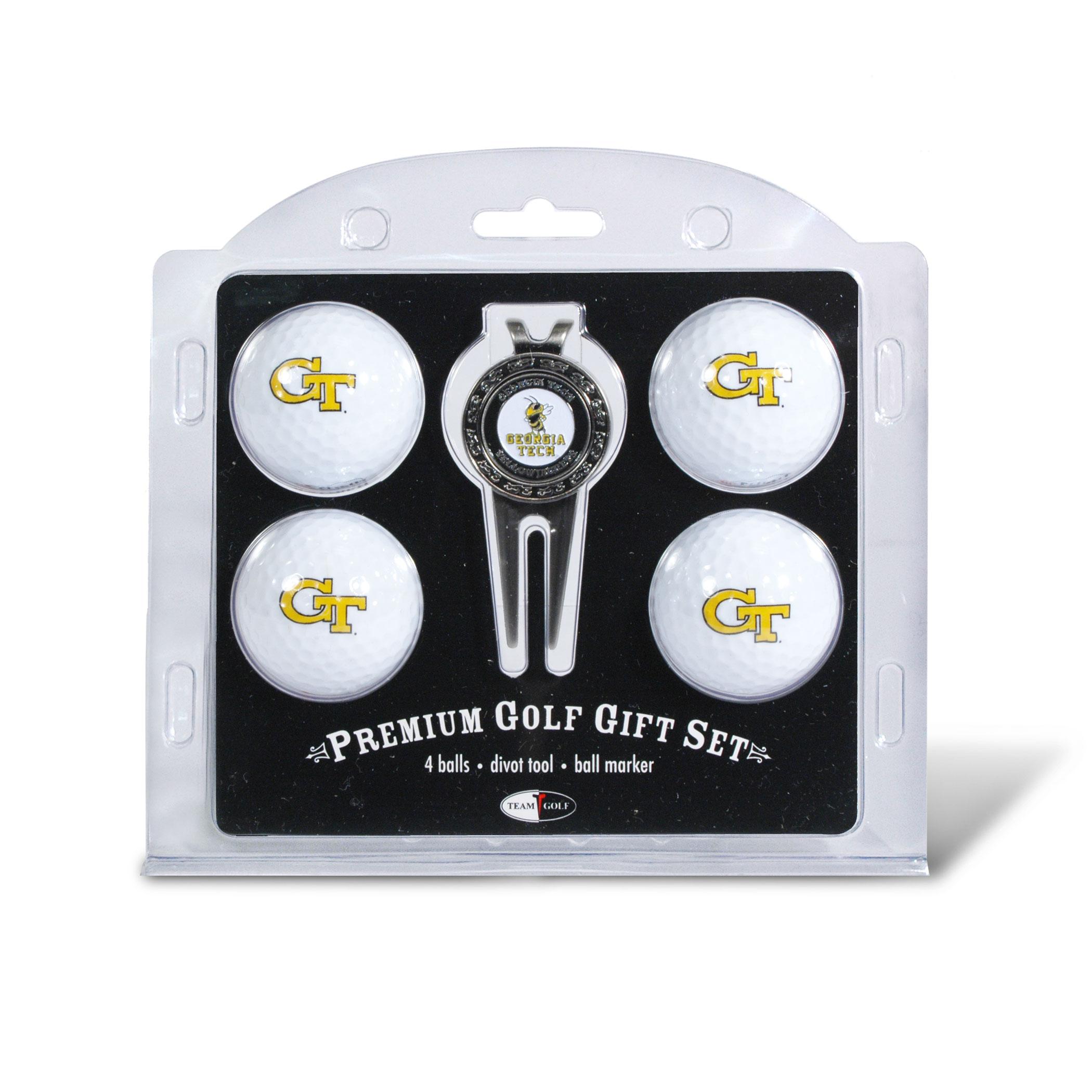 Georgia Tech Yellow Jackets logo 4 ball divot tool gift set contains 4 regulation imprinted golf balls, brass divot tool and 1 removable imprinted magnetic ball marker.