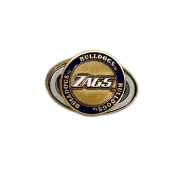 Large double-sided golf ball marker with the Gonzaga Bulldogs logo that is magnetically held to the metal clip which fits over the brim of your hat.