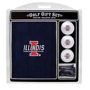 Each Illinois Illini logo embroidered golf gift set includes a 16" X 26" embroidered tri-fold Illinois Illini golf towel, 3 regulation Illinois Illini golf balls, and 12 golf tees.
