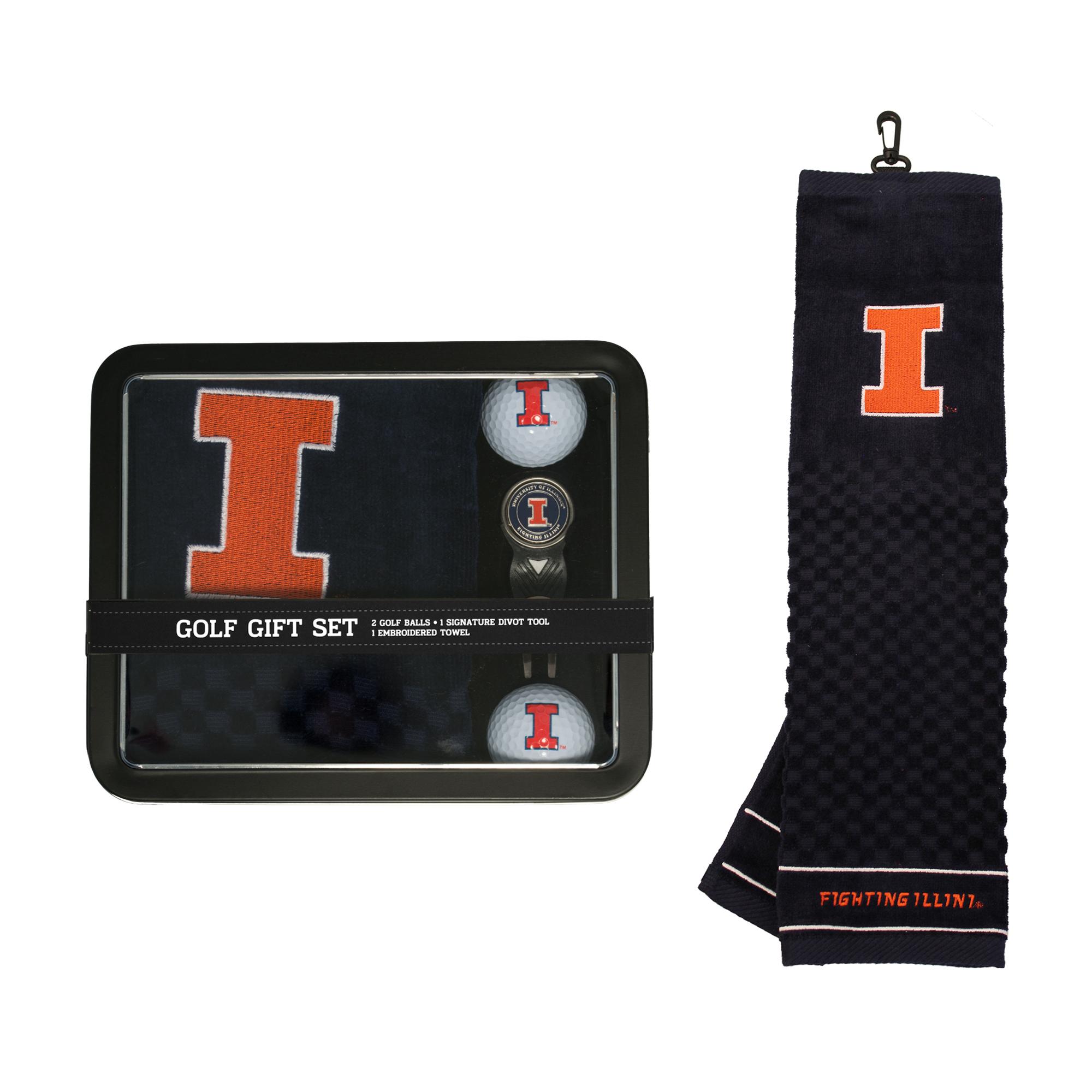 NCAA Golf Gift Set includes the following: (1)One Illinois Illini logo 16" x 22" 100% cotton tri-folded embroidered towel with scrubber pattern, swivel clip for easy bag attachment and team logo embroidery; (2) 2 Illinois Illini logo regulation golf balls with full color team logo durable imprint; and (3) One Illinois Illini logo specific divot tool and removable double sided enamel color fill magnetic marker, all housed in sleek tin packaging