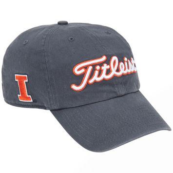 The Illinois Illini Logo Titleist Hat is an unstructured, cotton twill design with a popular pre-curved bill. The Illinois Illini Logo Titleist Hat has contrasting eyelets and buttons . There is a Titleist logo in raised embroidery on the front with a Titleist logo on and the Illinois Illini logo on the right side. Please indicate size when checking out M/L or L/XL