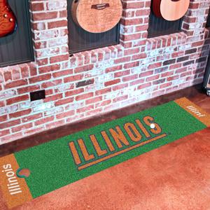 Practice your putting skills with this dual use Illinois Illini logo runner. This realistic Illinois Illini logo putting green runner acts as a putting practice surface as well as a runner with the Illinois Illini color and logo. Looks good in your game room, office or any room you choose. Includes a secure fit plastic target barrier bumper under the Illinois Illini logo mat that acts as a putting hole. Has a 11 on the Stimp meter, and it is made of a Chromojet-printed nylon surface with vinyl backing. Approximant measurements are 18” x 72", and it is officially licensed. Not available for expedited delivery. All mats are made to order therefore may take up to 2 weeks to ship.