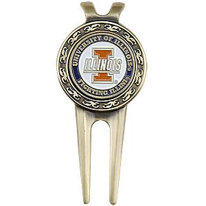 Illinois Illini logo golf divot repair tool is a vital component for every golfer's game. Heavy gauge metal construction that will provide years of use to repair divots, mark your ball, and clean turf from your cleats. Top design of the Illinois Illini logo divot repair tool is ideal for a club holder, and the integrated clip offers versatility, which can be used as a money clip or to hold the tool securely to your pocket or belt. Beautiful antique brass finish and approximately 3" in length. Large ball marker on the front that is magnetically held to tool with the Illinois Illini logo and smaller marker on back of the Illinois Illini logo divot repair tool that is magnetically held in place.