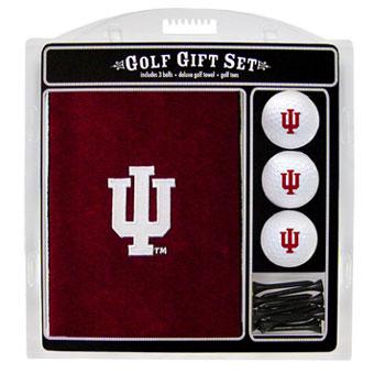 Each Indiana Hoosiers logo embroidered golf gift set includes a 16" X 26" embroidered tri-fold Indiana Hoosiers golf towel, 3 regulation Indiana Hoosiers golf balls, and 12 golf tees.
