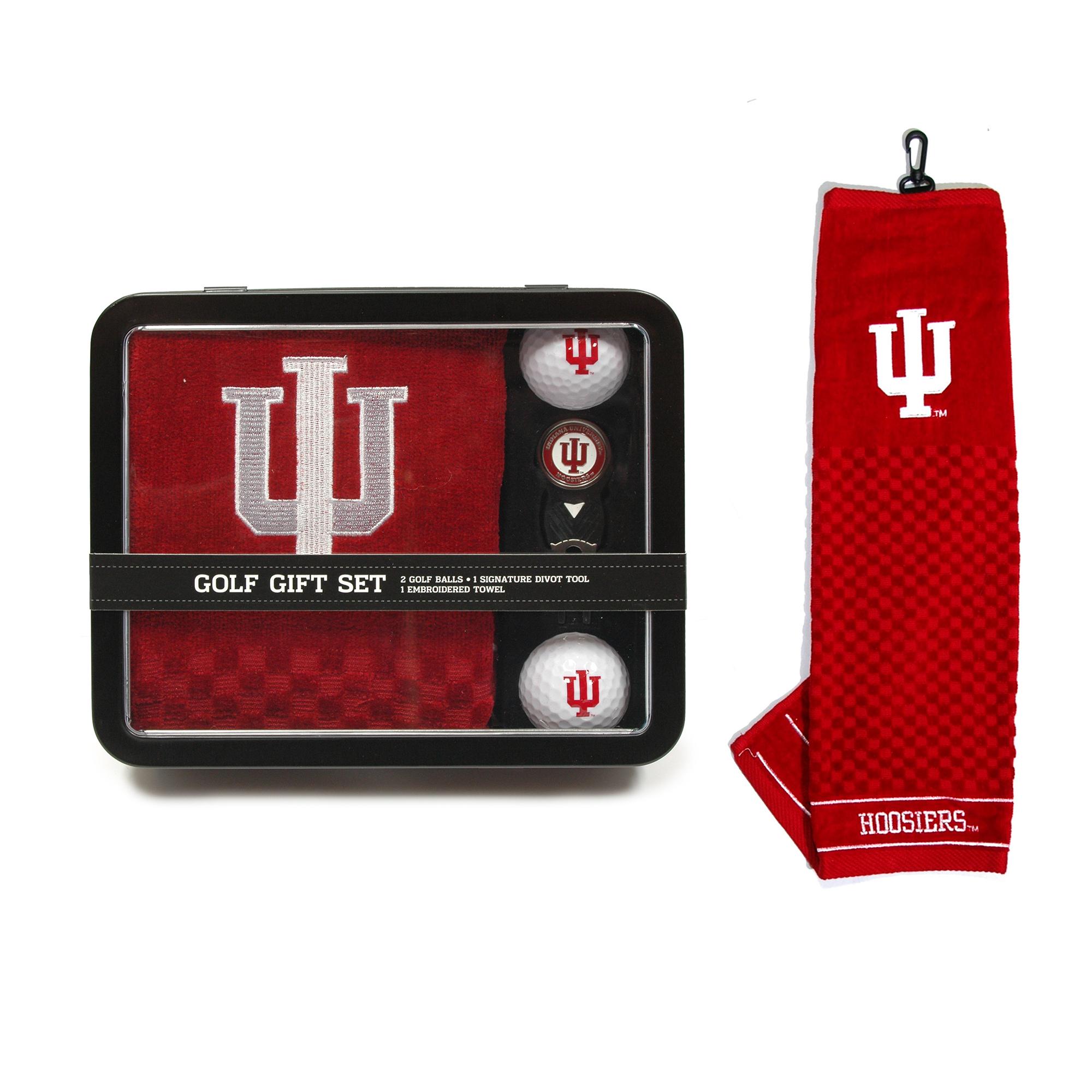 NCAA Golf Gift Set includes the following: (1)One Indiana Hoosiers logo 16" x 22" 100% cotton tri-folded embroidered towel with scrubber pattern, swivel clip for easy bag attachment and team logo embroidery; (2) 2 Indiana Hoosiers logo regulation golf balls with full color team logo durable imprint; and (3) One Indiana Hoosiers logo specific divot tool and removable double sided enamel color fill magnetic marker, all housed in sleek tin packaging