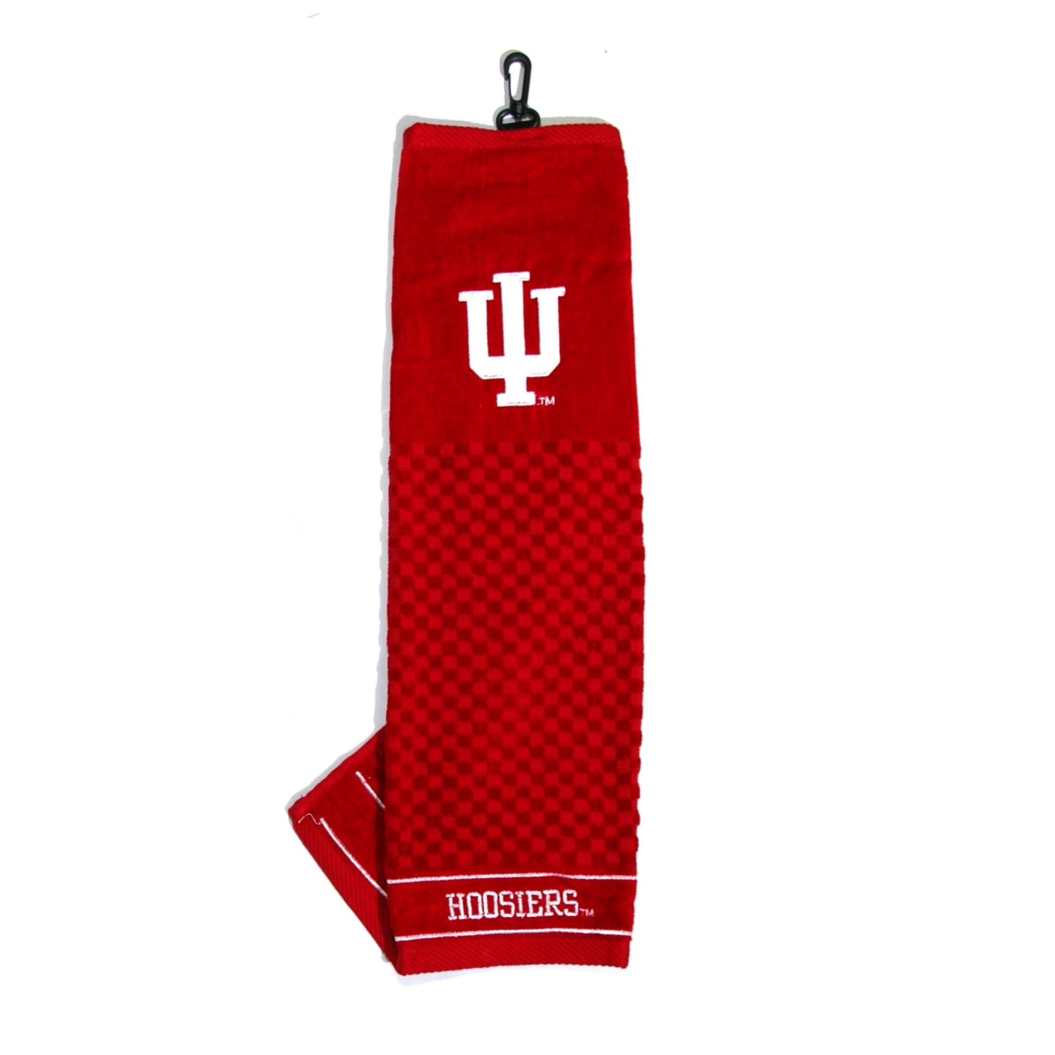 Premium weight 16" x 26" Indiana Hoosiers logo embroidered tri-fold golf towel made of sheared 100% cotton velour. Features a swivel clip attachment. Embroidered with the Indiana Hoosiers logo.