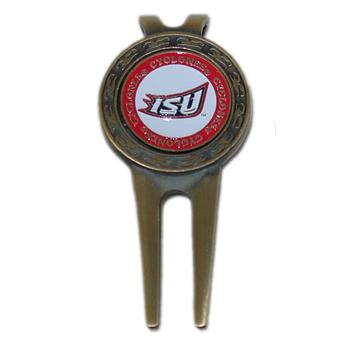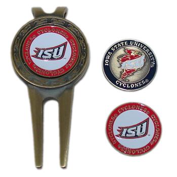 Iowa State Cyclones logo golf divot repair tool is a vital component for every golfer's game. Heavy gauge metal construction that will provide years of use to repair divots, mark your ball, and clean turf from your cleats. Top design of the Iowa State Cyclones logo divot repair tool is ideal for a club holder, and the integrated clip offers versatility, which can be used as a money clip or to hold the tool securely to your pocket or belt. Beautiful antique brass finish and approximately 3" in length. Large ball marker on the front that is magnetically held to tool with the Iowa State Cyclones logo and smaller marker on back of the Iowa State Cyclones logo divot repair tool that is magnetically held in place.