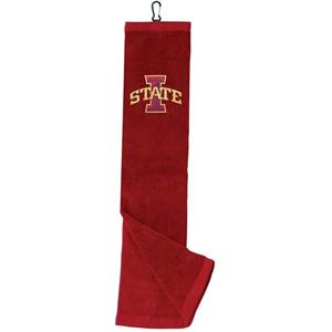 Premium weight 16" x 26" Iowa State Cyclones logo embroidered tri-fold golf towel made of sheared 100% cotton velour. Features a swivel clip attachment. Embroidered with the Iowa State Cyclones logo.