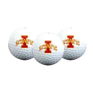 Three quality surlyn covered golf balls imprinted with the Iowa State Cyclones college logo.