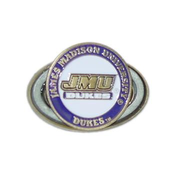Large double-sided golf ball marker with the James Madison Dukes logo that is magnetically held to the metal clip which fits over the brim of your hat.