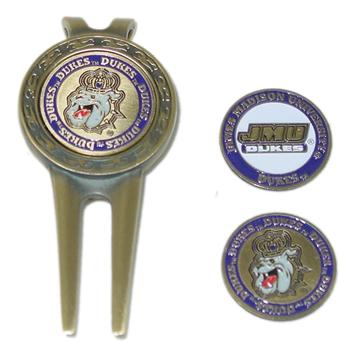 James Madison Dukes logo golf divot repair tool is a vital component for every golfer's game. Heavy gauge metal construction that will provide years of use to repair divots, mark your ball, and clean turf from your cleats. Top design of the James Madison Dukes logo divot repair tool is ideal for a club holder, and the integrated clip offers versatility, which can be used as a money clip or to hold the tool securely to your pocket or belt. Beautiful antique brass finish and approximately 3" in length. Large ball marker on the front that is magnetically held to tool with the James Madison Dukes logo and smaller marker on back of the James Madison Dukes logo divot repair tool that is magnetically held in place.