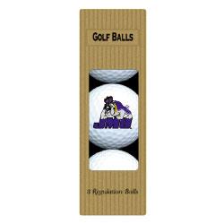 Three quality surlyn covered golf balls imprinted with the James Madison Dukes college logo.