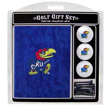 Each Kansas Jayhawks logo embroidered golf gift set includes a 16" X 26" embroidered tri-fold Kansas Jayhawks golf towel, 3 regulation Kansas Jayhawks golf balls, and 12 golf tees.