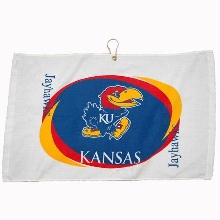 Standard weight 16" x 26" Kansas Jayhawks logo printed golf towel, made of durable 100% cotton. Features a center placement brass grommet and hook that allows for easy access and keeps towel off the ground. Printed with the Kansas Jayhawks trademark.