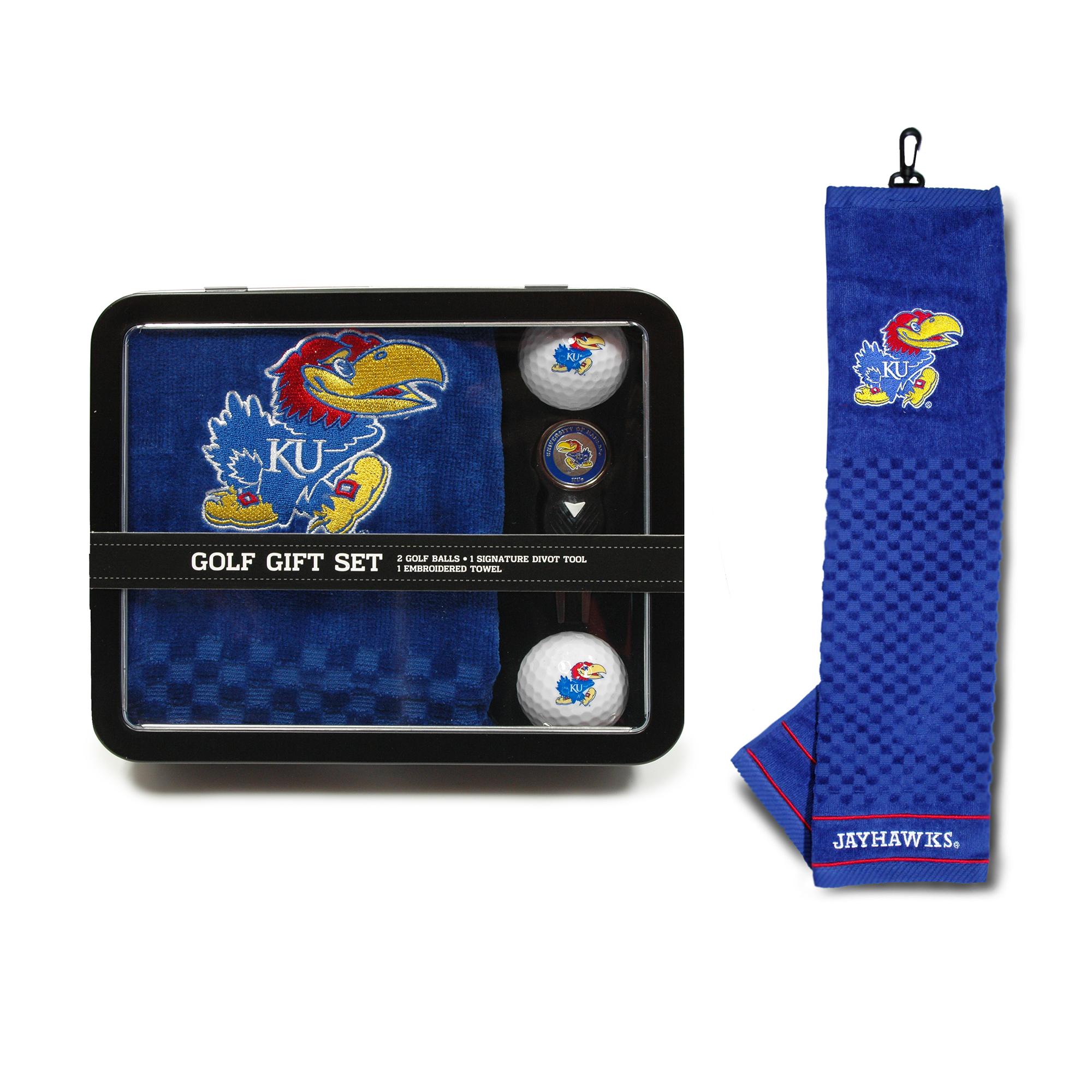 NCAA Golf Gift Set includes the following: (1)One Kansas Jayhawks logo 16" x 22" 100% cotton tri-folded embroidered towel with scrubber pattern, swivel clip for easy bag attachment and team logo embroidery; (2) 2 Kansas Jayhawks logo regulation golf balls with full color team logo durable imprint; and (3) One Kansas Jayhawks logo specific divot tool and removable double sided enamel color fill magnetic marker, all housed in sleek tin packaging