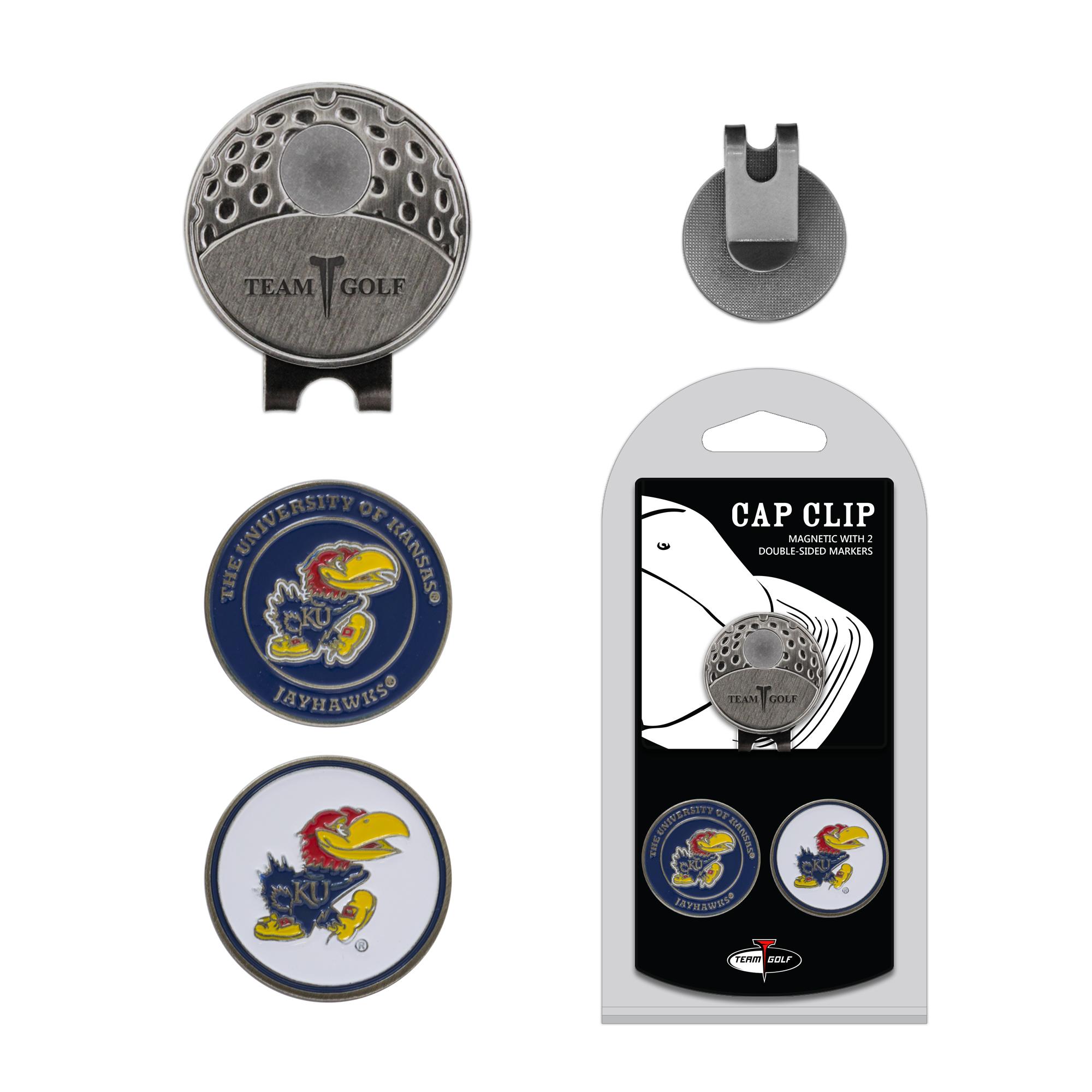 Large double-sided golf ball marker with the Kansas Jayhawks logo that is magnetically held to the metal clip which fits over the brim of your hat.