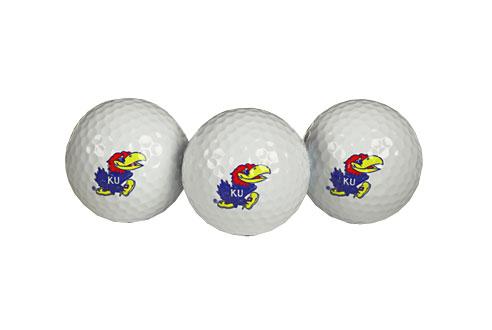 Three quality surlyn covered golf balls imprinted with the Kansas Jayhawks college logo.