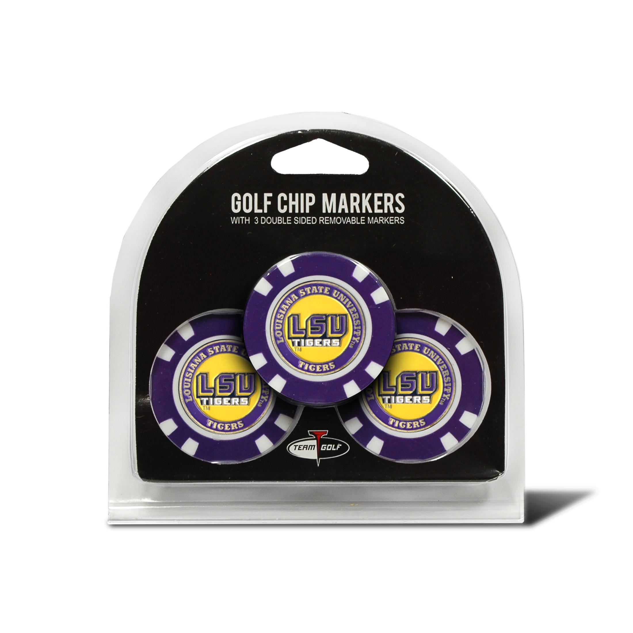 The LSU Tigers Poker Chip Ball Marker Gift Set perfect gift for any fan, student, or alumni. The LSU Tigers Poker Chips come with a LSU Tigers Team Logo Removable ball marker in the center of each chip.