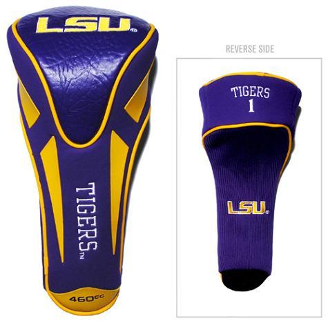 LSU Tigers Apex Driver Golf Head Cover Take your team pride to the golf course with this LSU Tigers Jumbo Apex Headcover. This LSU Tigers headcover is made of buffalo vinyl and synthetic suede with a truly sleek design. Fits all oversized Drivers. Includes 4 location team embroidery. Officially licensed by the NCAA