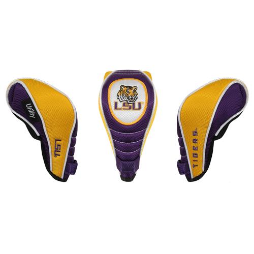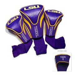 LSU Tigers Contour Fit Headcover Set. Take your team pride to the golf course with this LSU Tigers Contour Fit Headcover Set. Set includes 3 stylish contoured headcovers with innovative materials and sleek design - numbered 1, 3 and X. *The #1 fits all oversized drivers *Nylon sock protects shafts from damage *Officially licensed by the NCAA