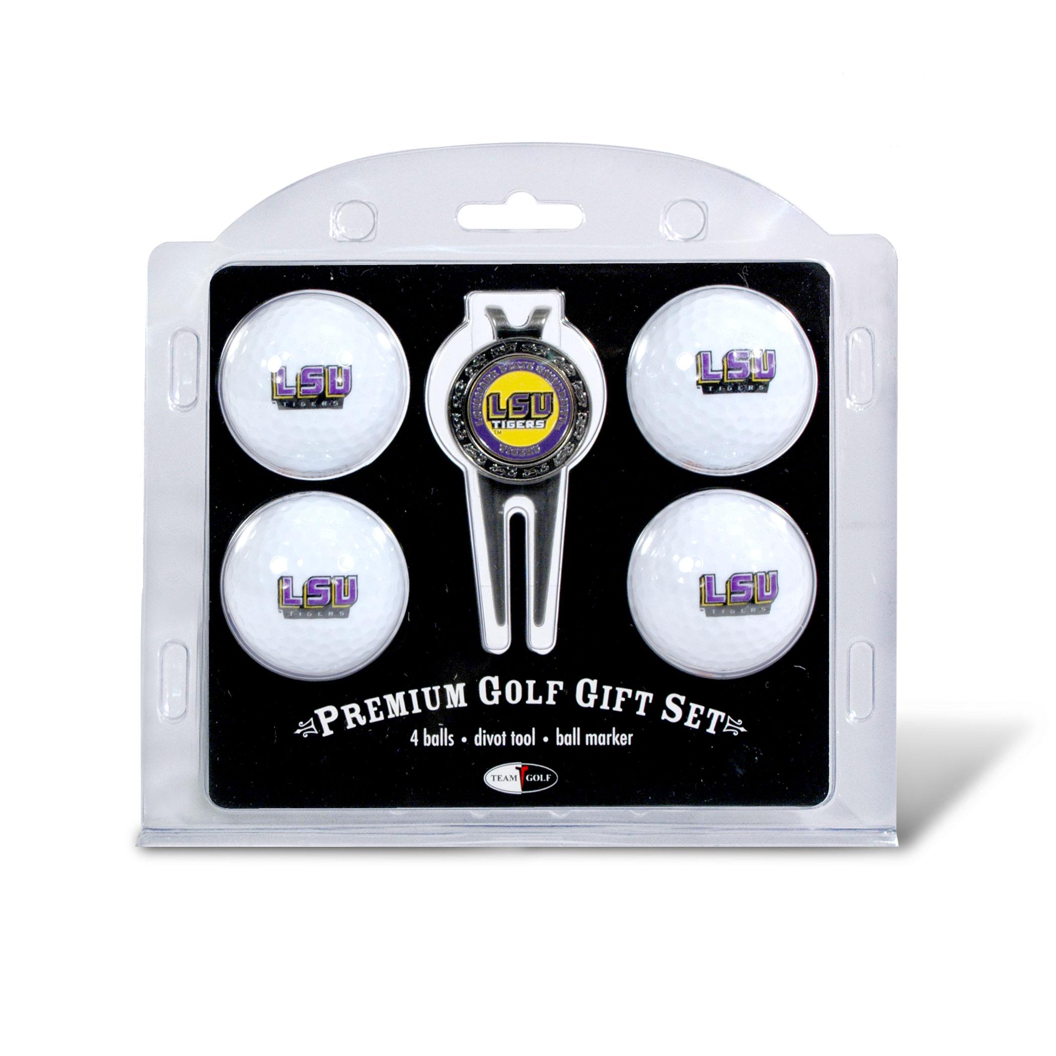 LSU Tigers logo 4 ball divot tool gift set contains 4 regulation imprinted golf balls, brass divot tool and 1 removable imprinted magnetic ball marker.