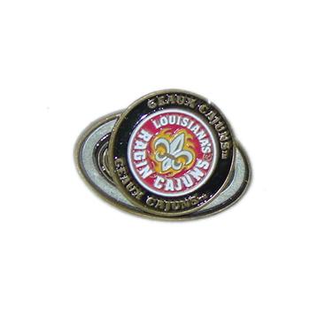 Large double-sided golf ball marker with the Louisiana-Lafayette Ragin' Cajuns logo that is magnetically held to the metal clip which fits over the brim of your hat.