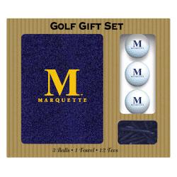 Each Marquette Golden Eagles logo embroidered golf gift set includes a 16" X 26" embroidered tri-fold Marquette Golden Eagles golf towel, 3 regulation Marquette Golden Eagles golf balls, and 12 golf tees.