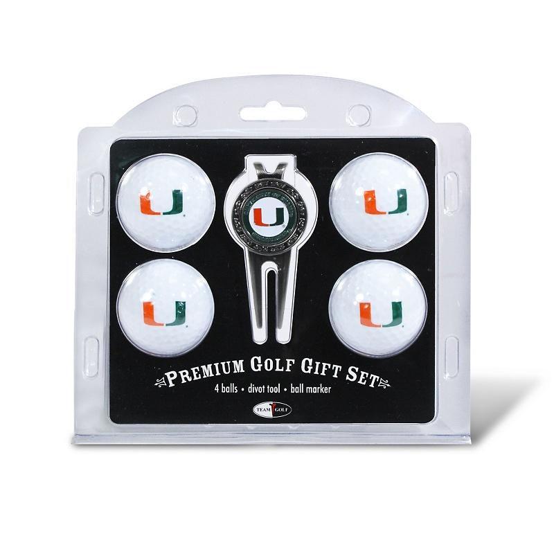 Miami Hurricanes logo 4 ball divot tool gift set contains 4 regulation imprinted golf balls, brass divot tool and 1 removable imprinted magnetic ball marker.