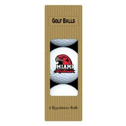 Three quality surlyn covered golf balls imprinted with the Miami (OH) Redhawks college logo.